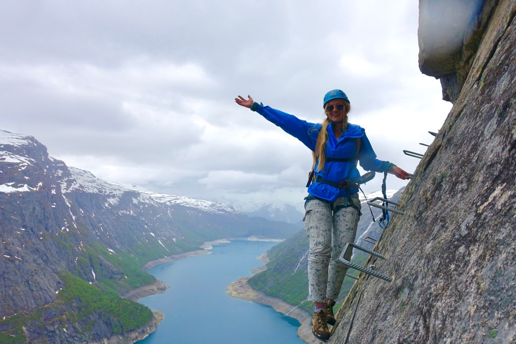 After 5 straight days of hiking, I put myself “out there” in Norway by signing up for the massive Trolltunga hike Via ferrata. This entailed first biking — despite my Belgium article, I have a hard time biking over rocky places. Followed by climbing 1,000+ ft. up a rocky cliff for over two hours. I am afraid of heights…. But I’m not afraid of adventure. I always know that pushing myself through things that I fear leads to a sense of accomplishment and bliss that cannot be matched by taking the easy way. If you don’t live on the edge, you’ll never see the view.